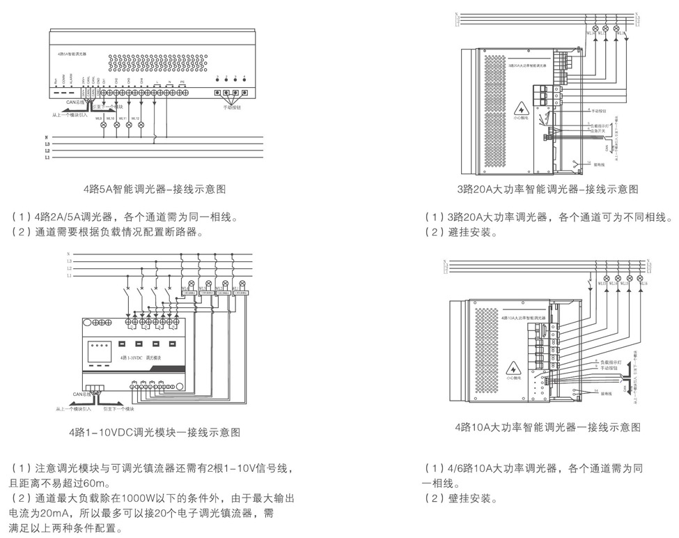 调光控制模块是用于对具备调光特性的照明灯具进行亮度调节的执行器,根据光源类型与回路负载选择匹配适合的调光器。支持可调光的灯具如:白炽灯、卤素灯、日光灯、LED灯、前(后)沿相控电子变压器等。