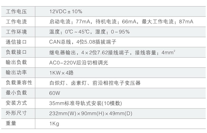 调光控制模块是用于对具备调光特性的照明灯具进行亮度调节的执行器,根据光源类型与回路负载选择匹配适合的调光器。支持可调光的灯具如:白炽灯、卤素灯、日光灯、LED灯、前(后)沿相控电子变压器等。