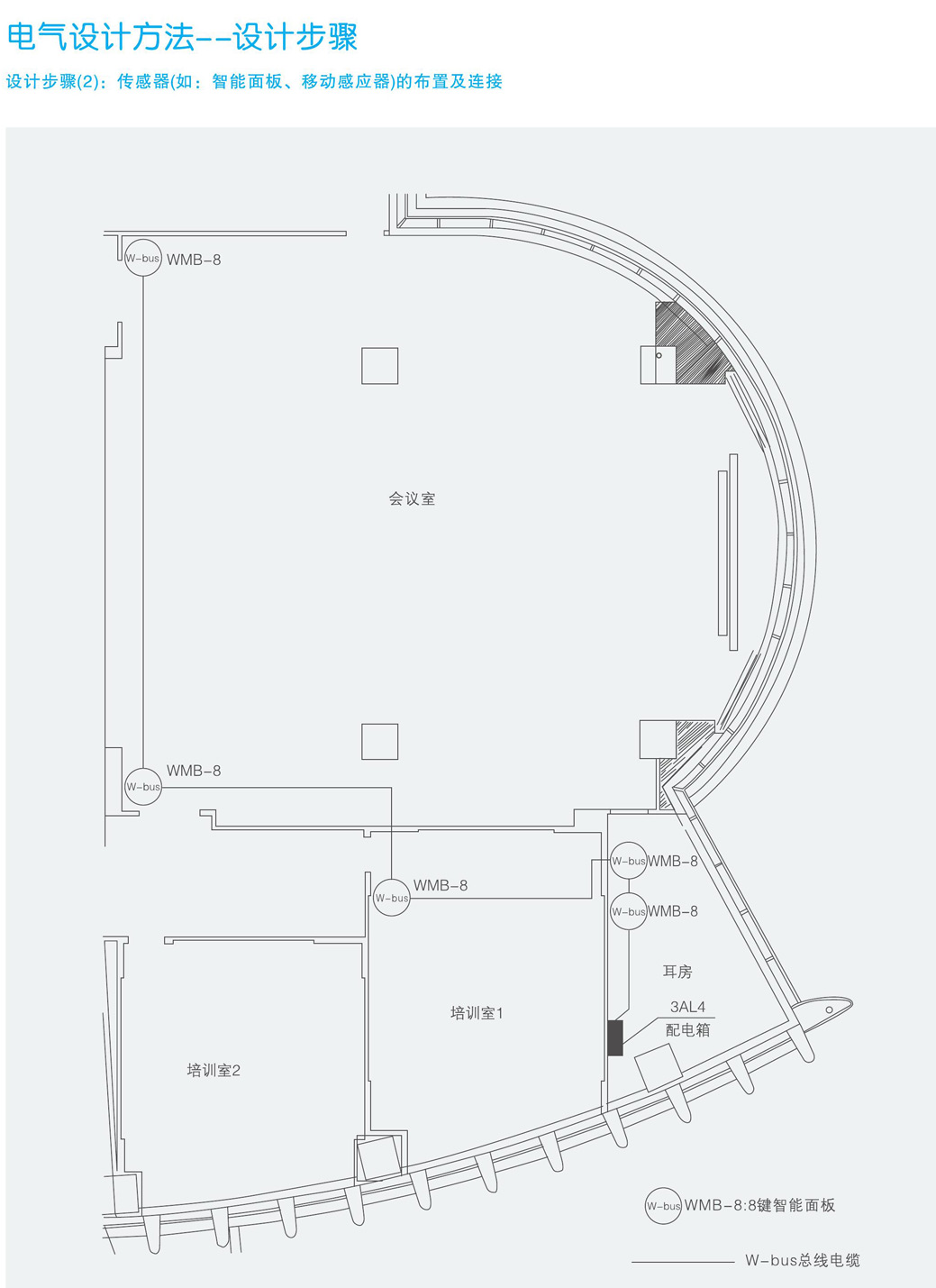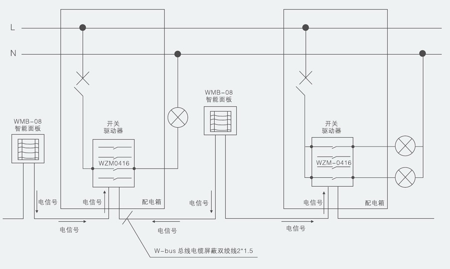 W-bus 系统中受控的负载直接与控制系统的驱动器相连,所有传感器(如:智能面板、移动感应器、光亮传感器)和驱动器(如:开关驱动器、窗帘驱动器)都是通过一种通信介质(如:W-bus总线)相互连接在一起。当一个智能面板的按钮被按下时,它通过通信介质W-bus总线向设定的驱动器以电信号的形式发出一个指令,驱动器收到电信号后经过内置CPU进行信息处理然后在驱动负载。实现相应的功能。