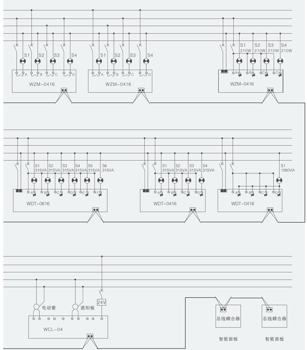 ⑤ 各个配电箱内分别分散安装各种驱动器,用于驱动灯光、电动窗帘等,驱动器采用标准DIN导轨安装方式,每个驱动器均为标准模数化的模块。