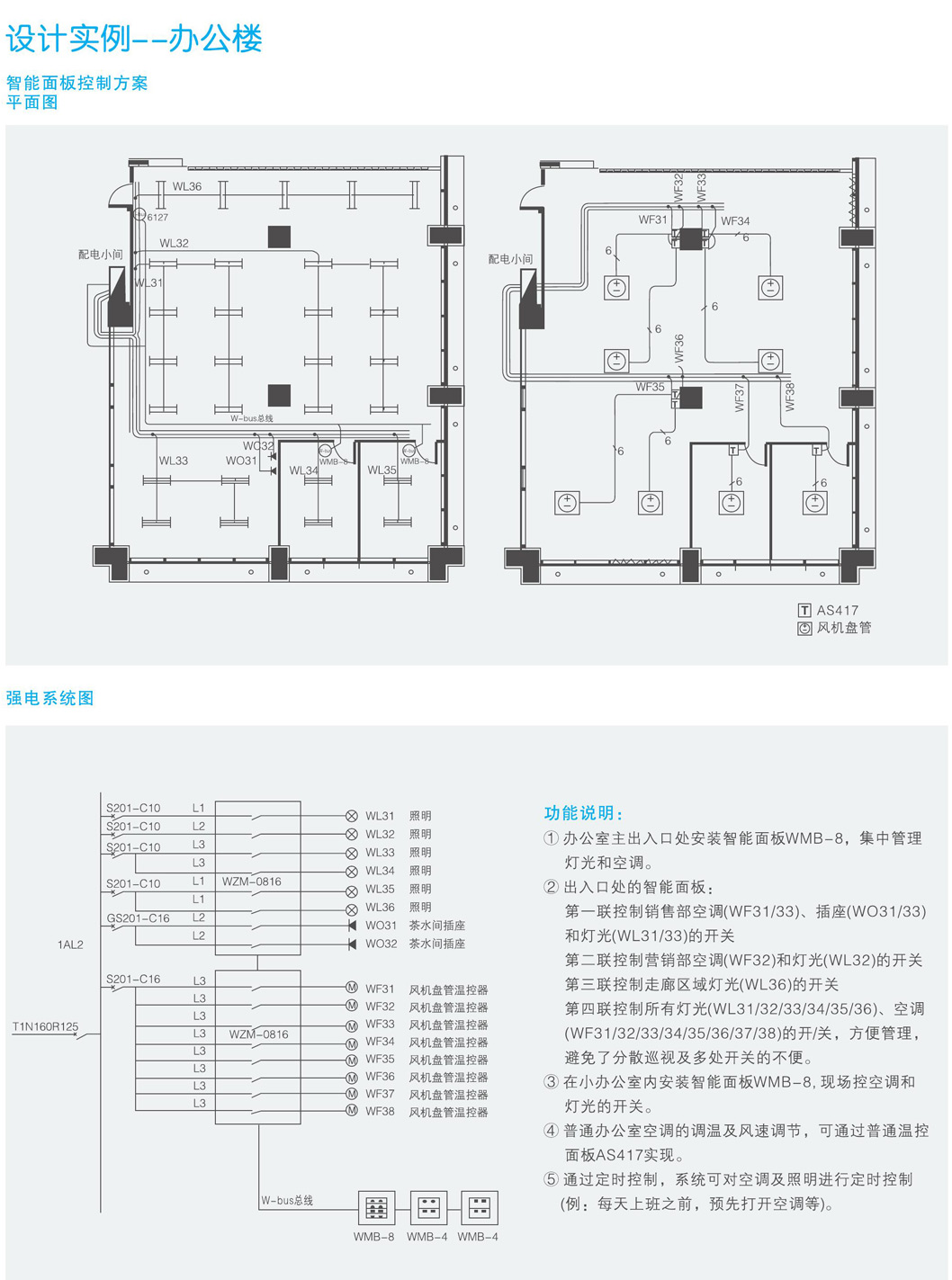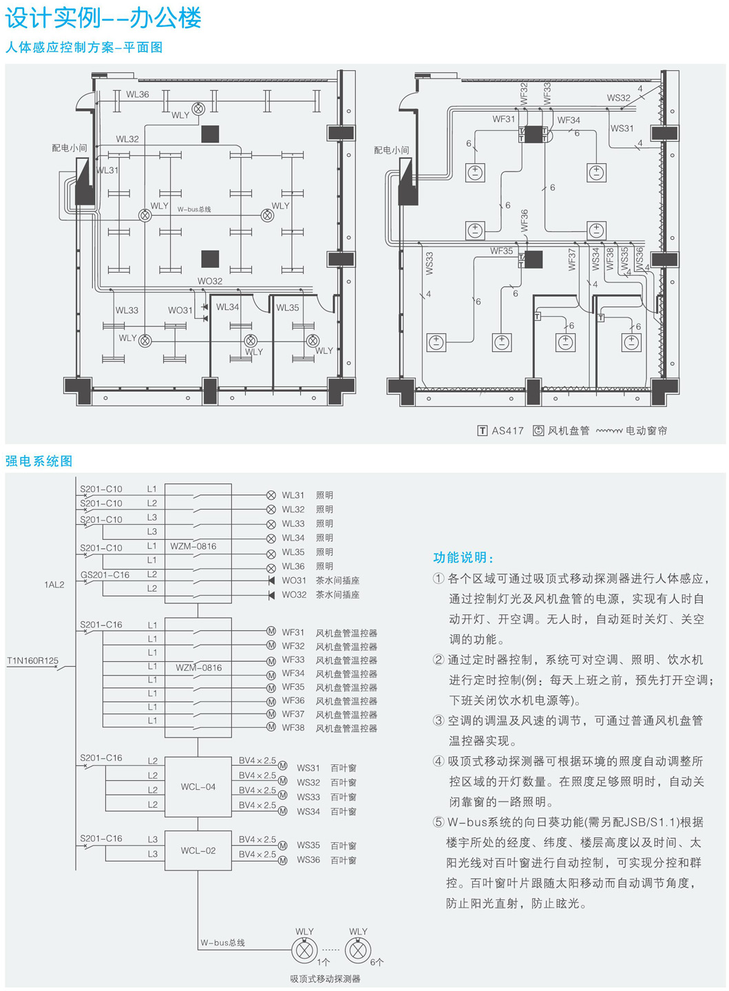 ① W-bus 系统可通过中控图形化界面对整个办公楼的灯光、遮阳、空调进行集中监视及控制,方便系统的维护和节能管理同时还可监视每个楼层配电箱主断路器是否跳闸以及浪涌保护器状态,从而更高效的管理维护。