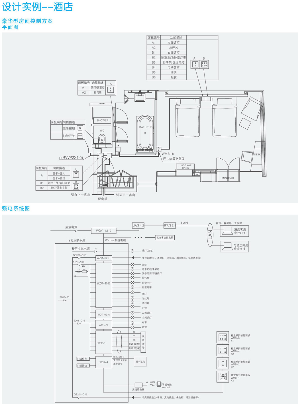 ① 基本功能:照明开关、空调本地控制、空调联网控制、电动窗帘、插座控制、房态监视。