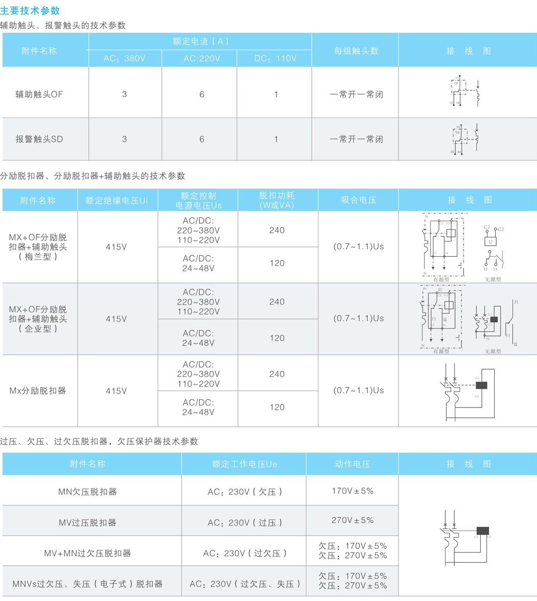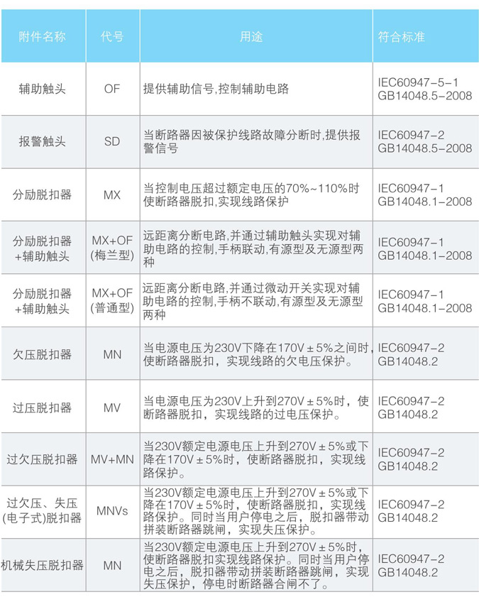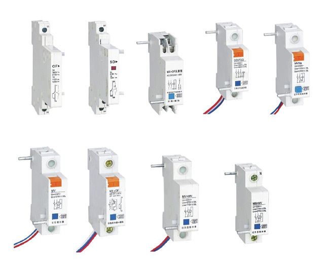 本系列断路器附件 是我公司专为DZ47-63、DZ47-125系列断路器配套设计的辅助功有元件,在家居、建筑等电气线路中,可以根据需要选择不同的电气附件与DZ47-63、DZ47-125系列断路器配合,以实现断路器的远程脱扣控制、分合状态指示、提供报警信号和线路的欠压、失压保护等功能,更好地保护线路、人身和财产安合。
