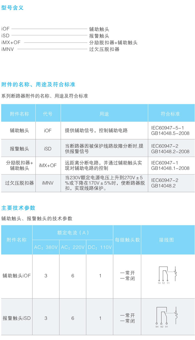本系列断路器附件是我公司专为iC65系列断路器配套设计的辅助功能元件,在家居、建筑等电气线路中,根据需要选择不同的电气附件与iC65断路器配合,以实现断路器因被保护线路故障的远程脱扣控制、提供辅助信号、分合状态指示、提供报警信号功能,更好地保护线路、人身和财产安全。