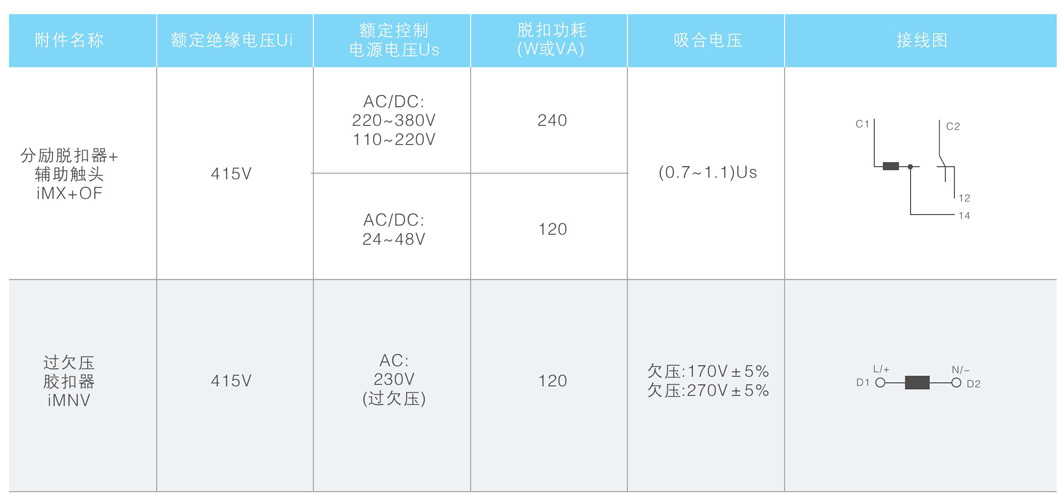 分励脱扣器、分励脱扣器 辅助开关及过欠压脱扣器的技术参数