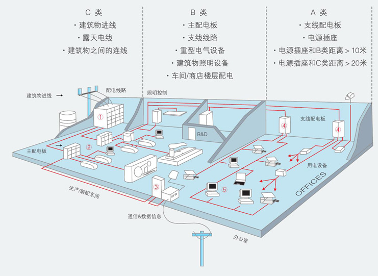 1、建筑物时电保护区 2、生产及关键负载保护区 3、通讯及数字线路保护区 4、行政办公保护区 5、数据信息安全保护区