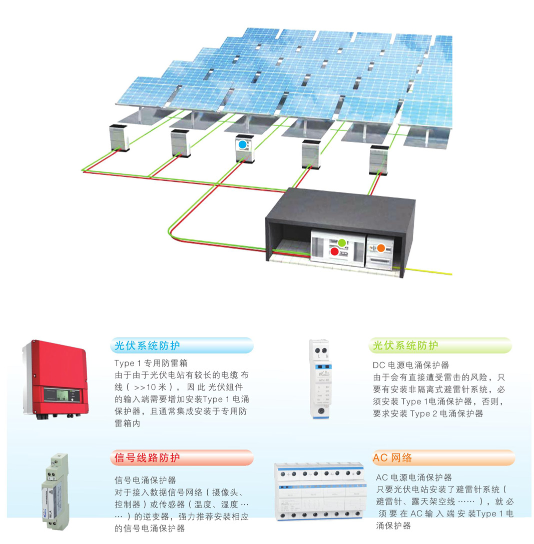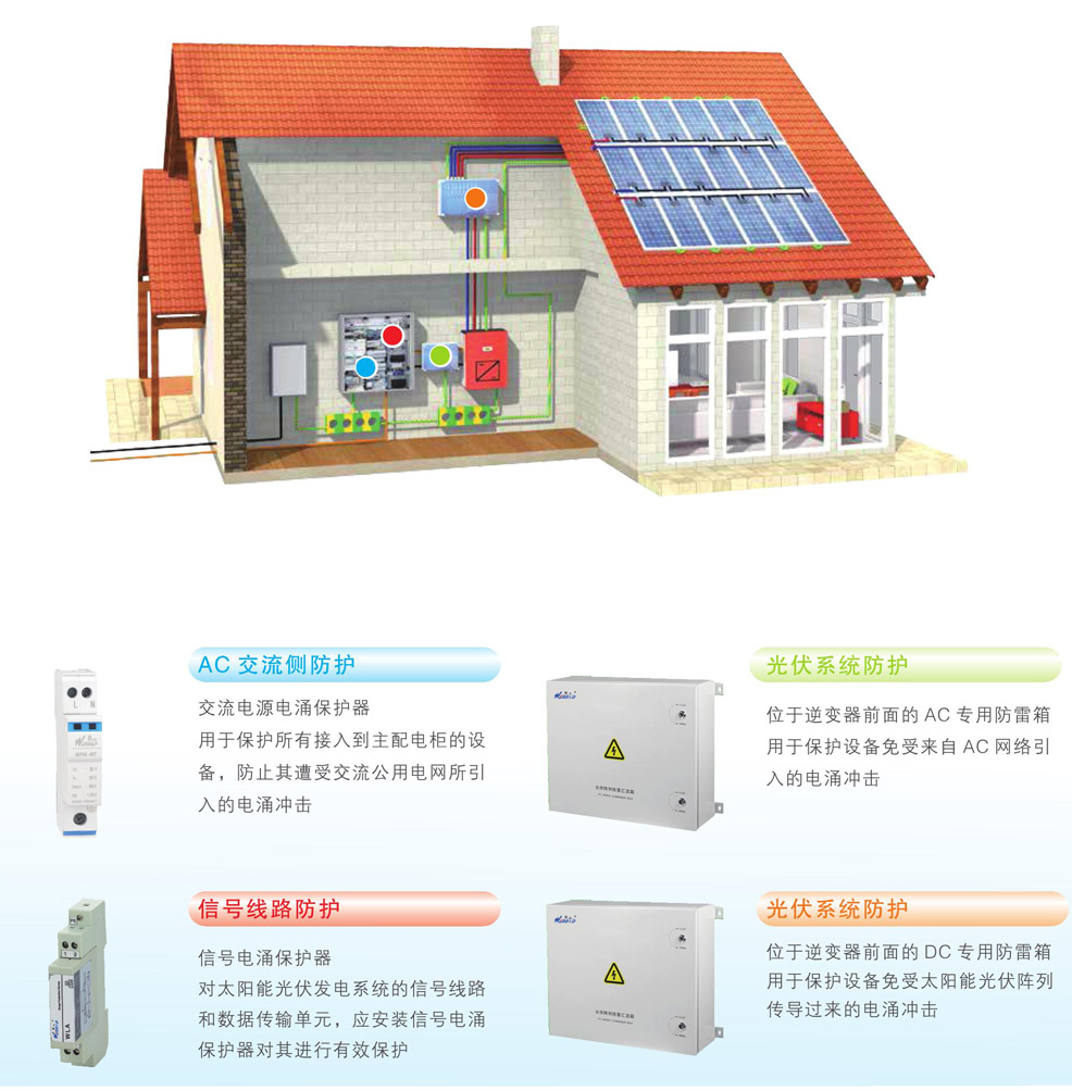 对于小功率的光伏系统的应用,即安装在住宅和小型办公室楼顶上,必须对直接接入电力系统的逆变器 AC 输出端和接入光伏组件的逆变器 DC 输入端进行电涌保护。