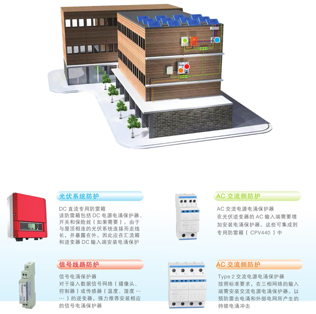 工业厂房和公共建筑等设施上光伏系统的逆变器里 AC 和 DC 输入端必须安装电涌保护器。在光伏系统侧,对于长度大于 10 米的电缆,必须在电缆线路的每一端增加安装电涌保护器。