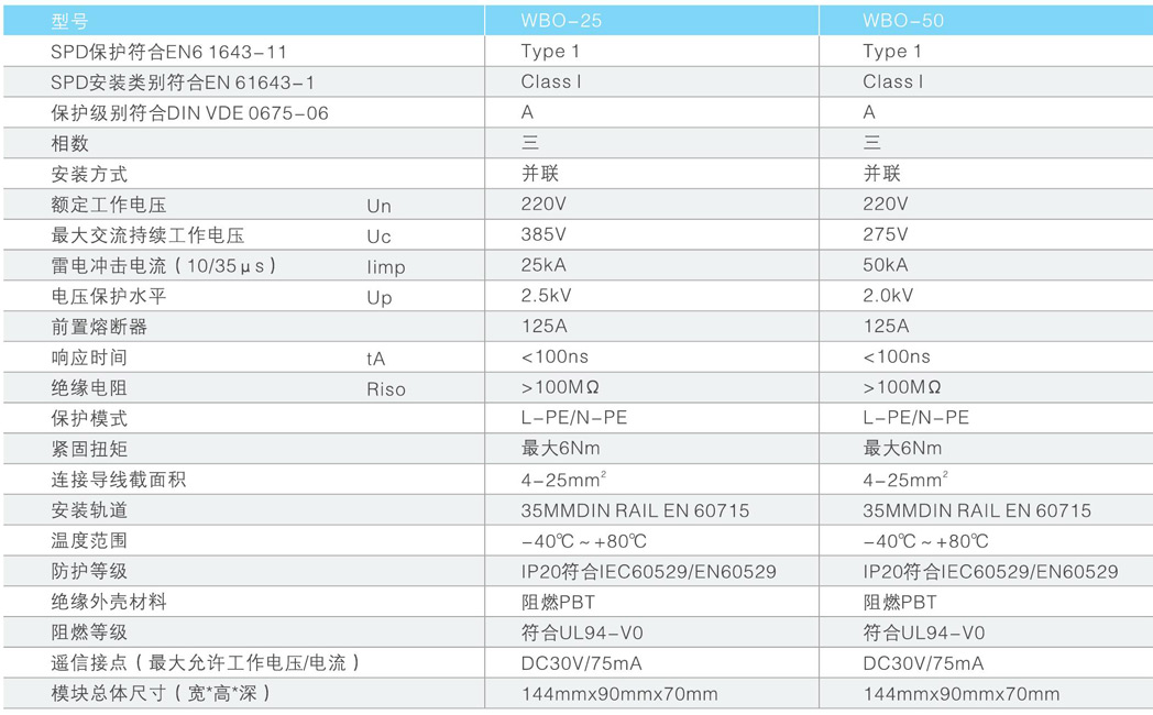 WBO系列交流电源电涌保护器是为了防止直击雷和感应雷而设计的,一般用于重雷区和直击雷风险高的地区,可将多个WBO系列产品并联使用,保护三相供电系统。