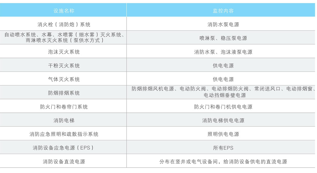 建筑物内为各类消防设备供电的交流或直流电源,包括主电源和备用电源,应设置传感器;传感器监测的内容包括但不限于下表