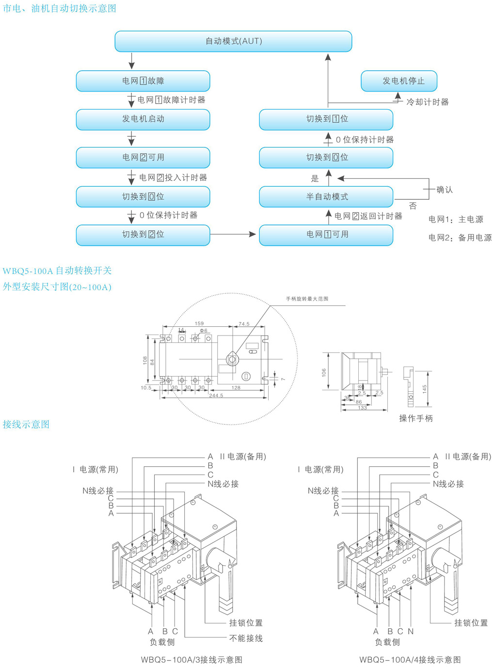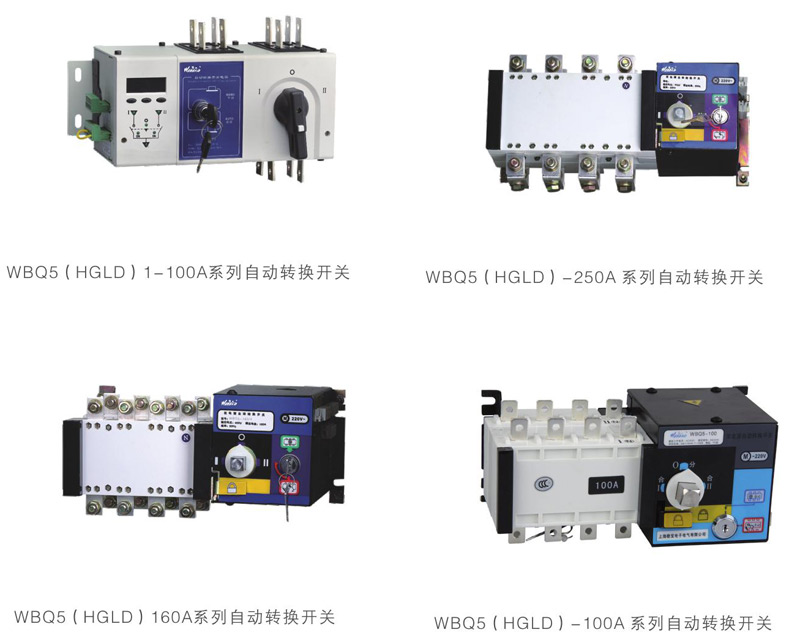 WBQ5(HGLD)1-100/4·III~400V In50A自动转换开关,约定发热电流100安培,交流额定电压400伏,额定电流50安培,4极(3极 可通断中性极),适用于市电——油机供电系统的自投自复。