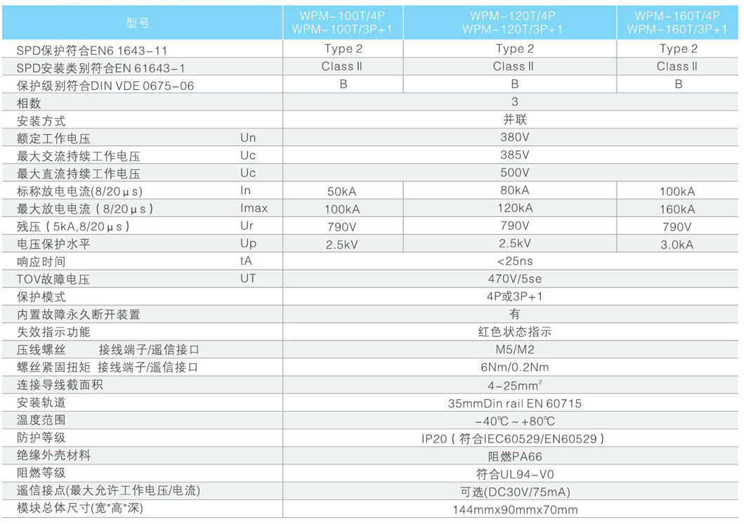 WPM/4P或3P 1系列三相交流电源电涌保护器是上海稳宝模块式产品的主要系列之一该组件有良好的防雷电性能安规性能和特殊的结构能够满足三相交流电源系统的安装维护要求完善的技术和设计确保了该系列产品运行的安全可靠性此系列产品适用于保护易受雷击的三相供电系统可根据不同通流量作为一二级保护器使用该产品采用并联保护方式通流能力强引入了独特的长寿命技术避免了同类产品易劣化失效的问题模块采用大冗余量设计加强了保护功能使得最大放电电流可达200kA模块外壳采用高性能阻燃材料及劣化自动脱离装置彻底避免爆炸和火灾实现劣化自动检测和保护功能同时该产品可选装报警遥控接点可加装雷击计数器