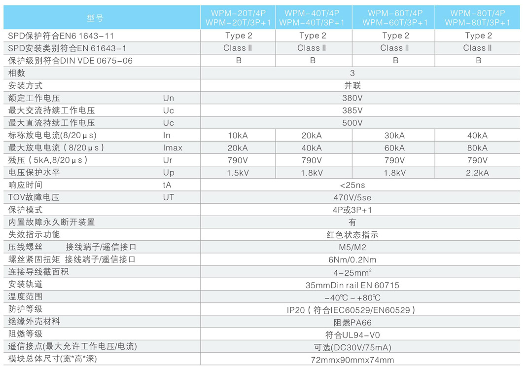 WPM/4P或3P 1系列三相交流电源电涌保护器是上海稳宝模块式产品的主要系列之一该组件有良好的防雷电性能安规性能和特殊的结构能够满足三相交流电源系统的安装维护要求完善的技术和设计确保了该系列产品运行的安全可靠性此系列产品适用于保护易受雷击的三相供电系统可根据不同通流量作为一二级保护器使用该产品采用并联保护方式通流能力强引入了独特的长寿命技术避免了同类产品易劣化失效的问题模块采用大冗余量设计加强了保护功能使得最大放电电流可达200kA模块外壳采用高性能阻燃材料及劣化自动脱离装置彻底避免爆炸和火灾实现劣化自动检测和保护功能同时该产品可选装报警遥控接点可加装雷击计数器